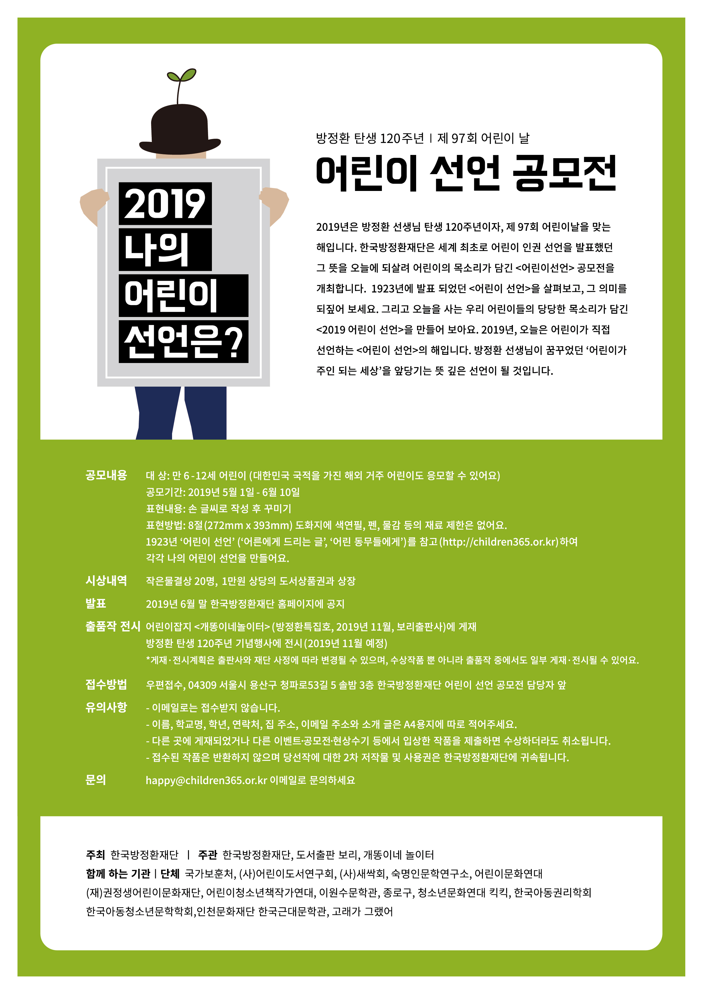 방정환 탄생 120주년 공모전 <2019 어린이선언> 포스터입니다.